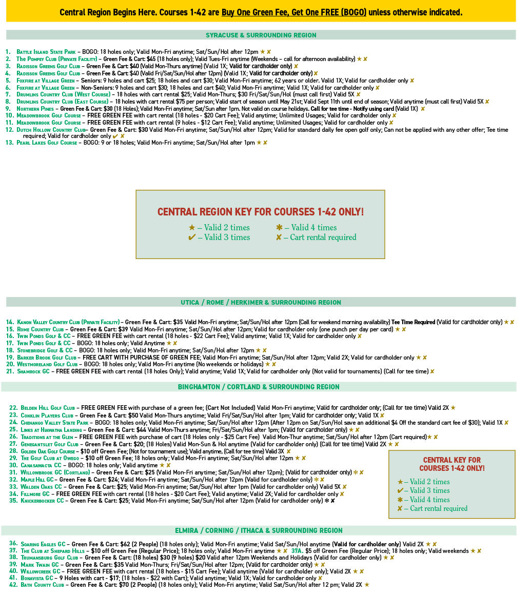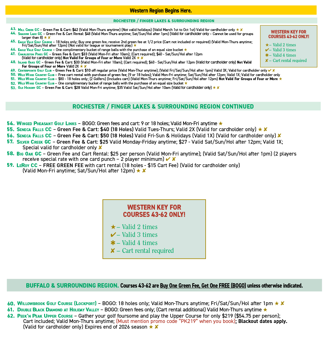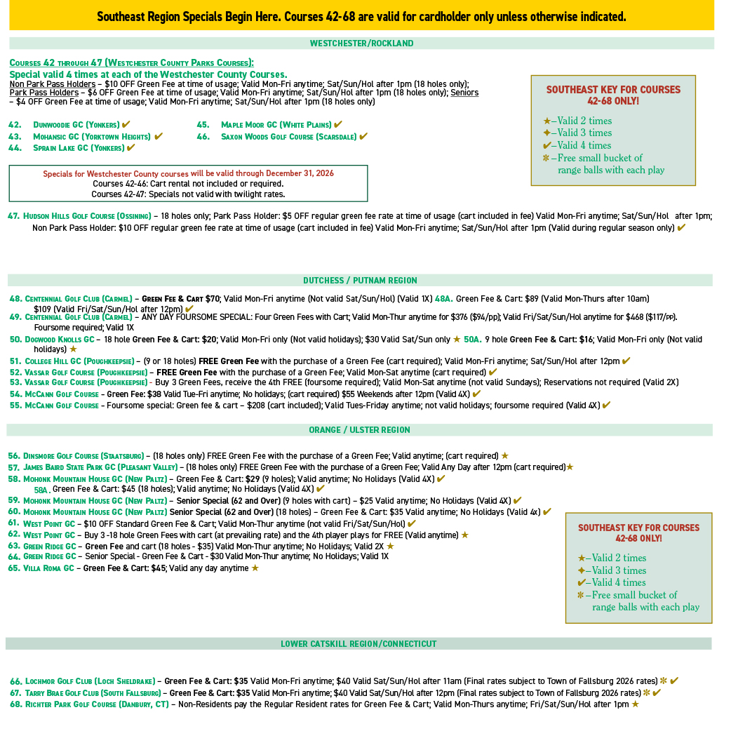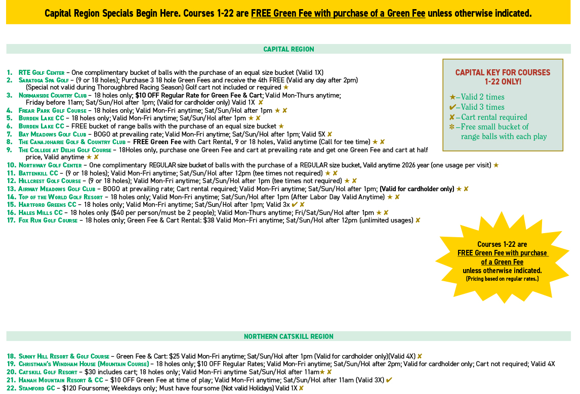 The 2026 Calendar includes many of the strongest deals available anywhere - tons of FREE Green Fees and deals for 18 holes w/cart for $25 or less! You'll pay for the calendar in just a couple usages! (All 4 Regions are included in one calendar!)
